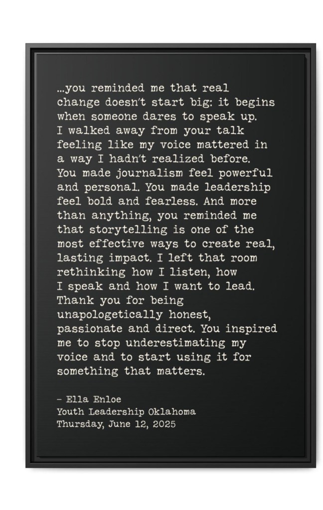 Each summer, Youth Leadership Oklahoma immerses high school students in a transformative, week-long journey across the state. For years now, I and a host of other local leaders speak to the students when they come through Tulsa. This quote came from an email I received from a student after she heard my talk in 2025.